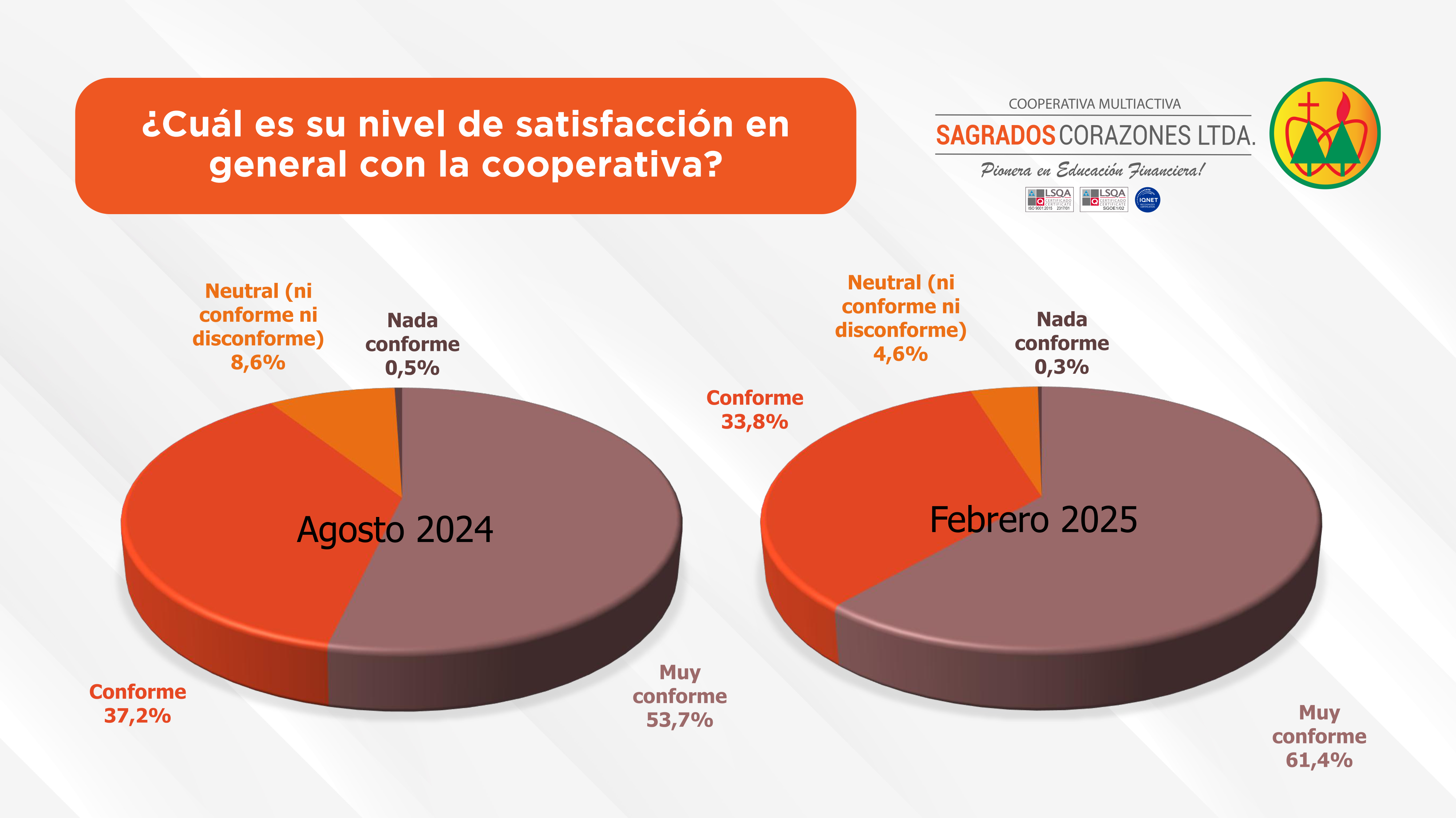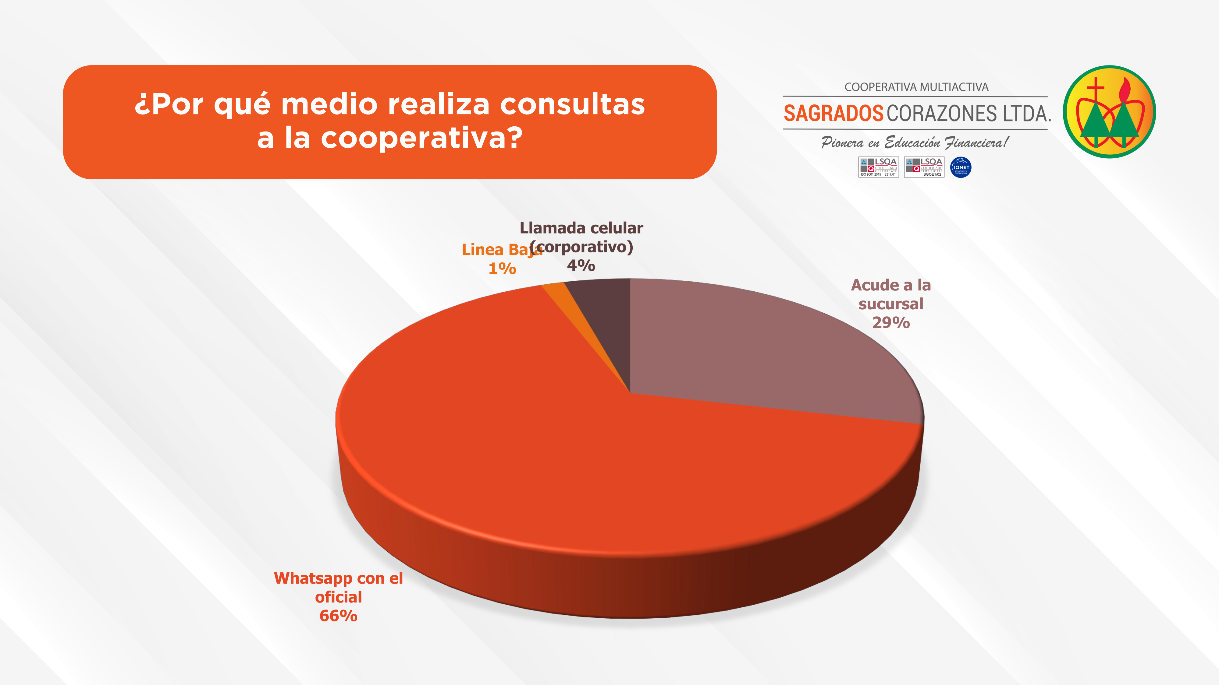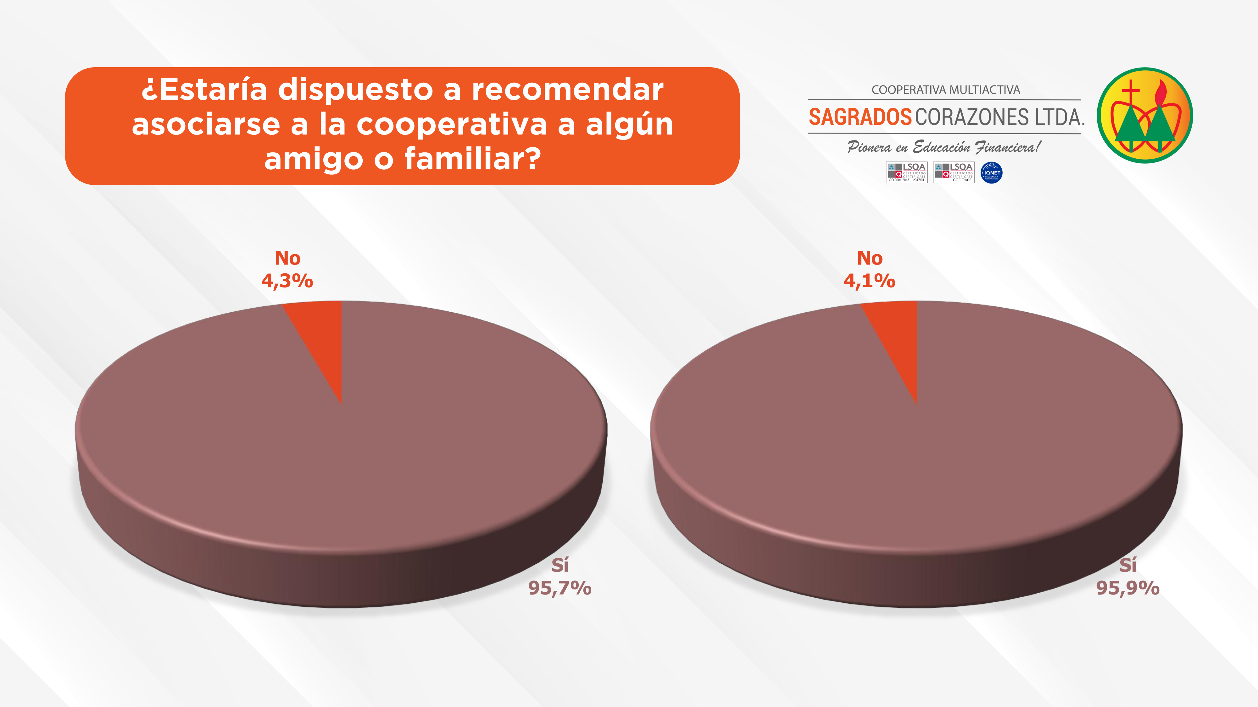 La Cooperativa Sagrados Corazones Ltda. viene realizando año tras año la encuesta de satisfacción del socio como parte fundamental de su proceso de certificación de la Norma ISO 9001:2015 del Sistema de Gestión de Calidad.