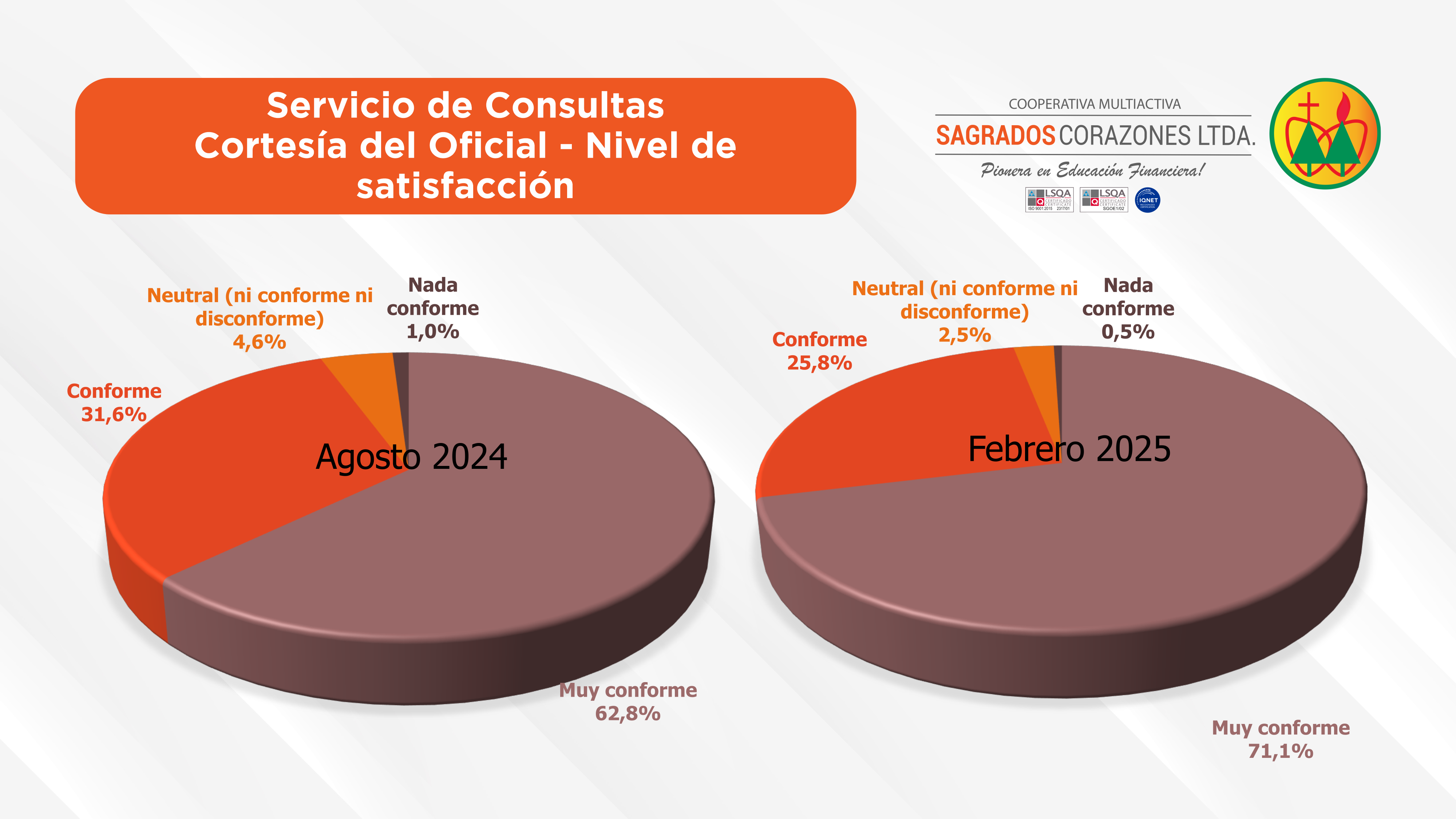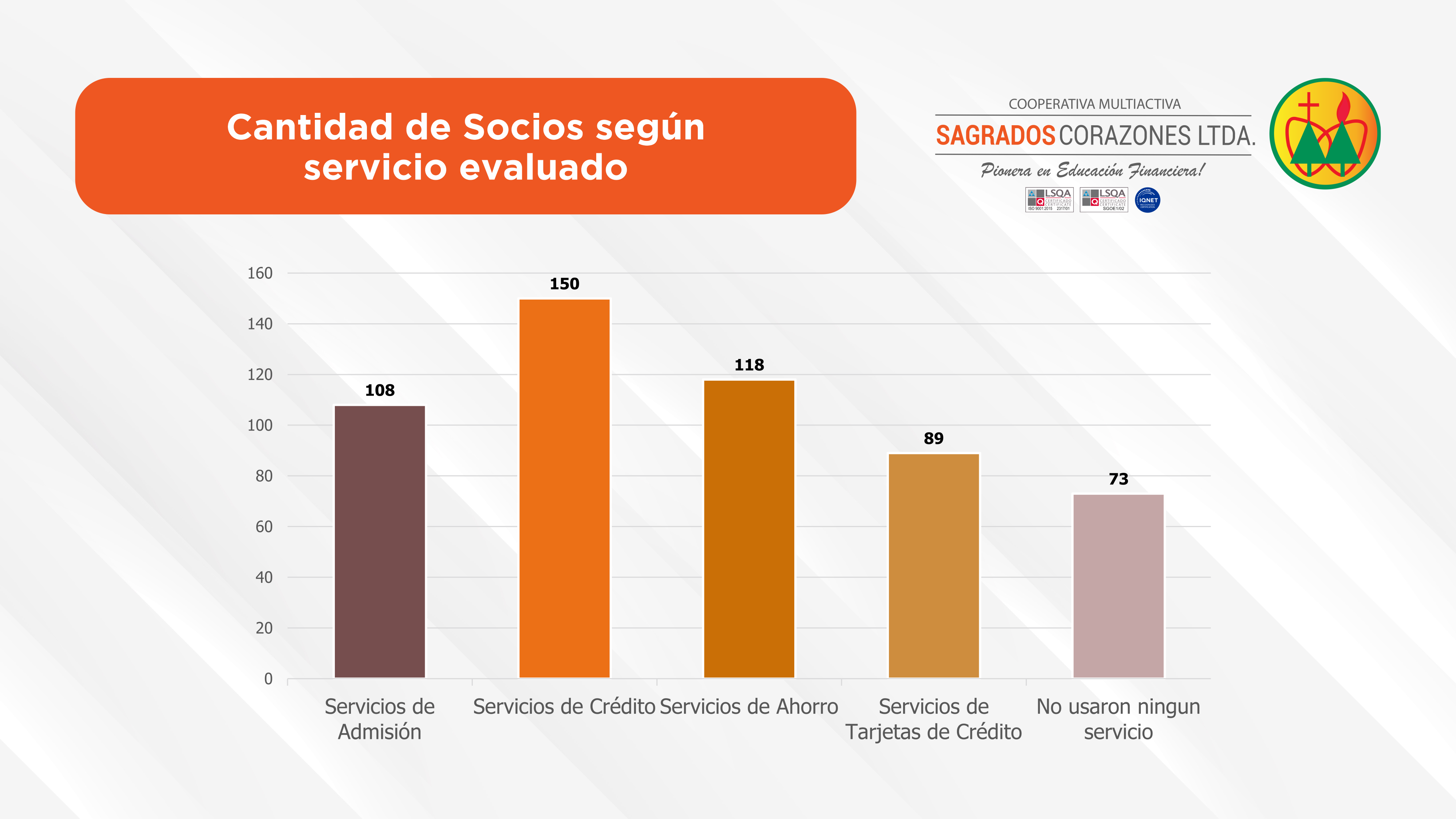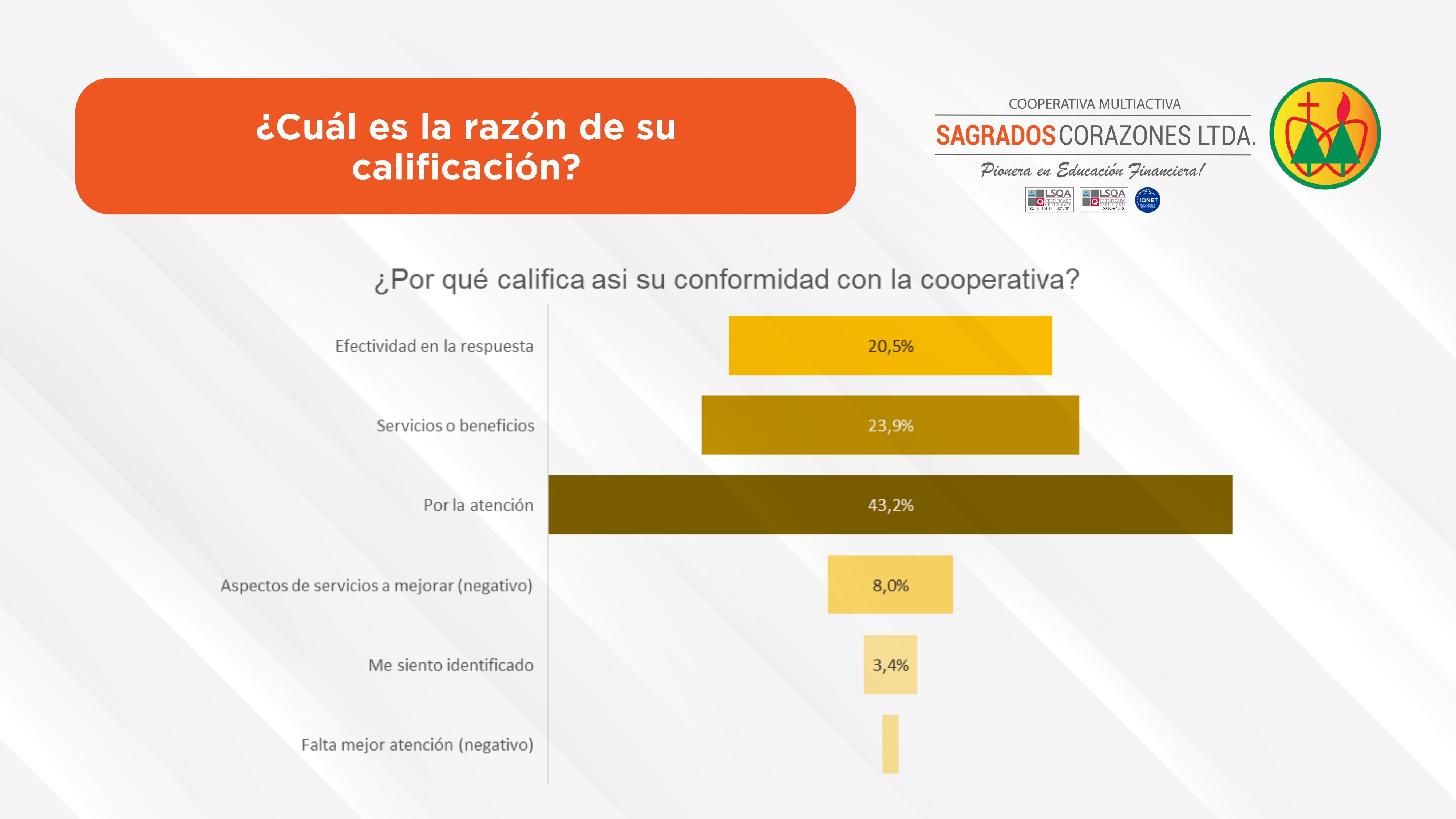 La Cooperativa Sagrados Corazones Ltda. viene realizando año tras año la encuesta de satisfacción del socio como parte fundamental de su proceso de certificación de la Norma ISO 9001:2015 del Sistema de Gestión de Calidad.