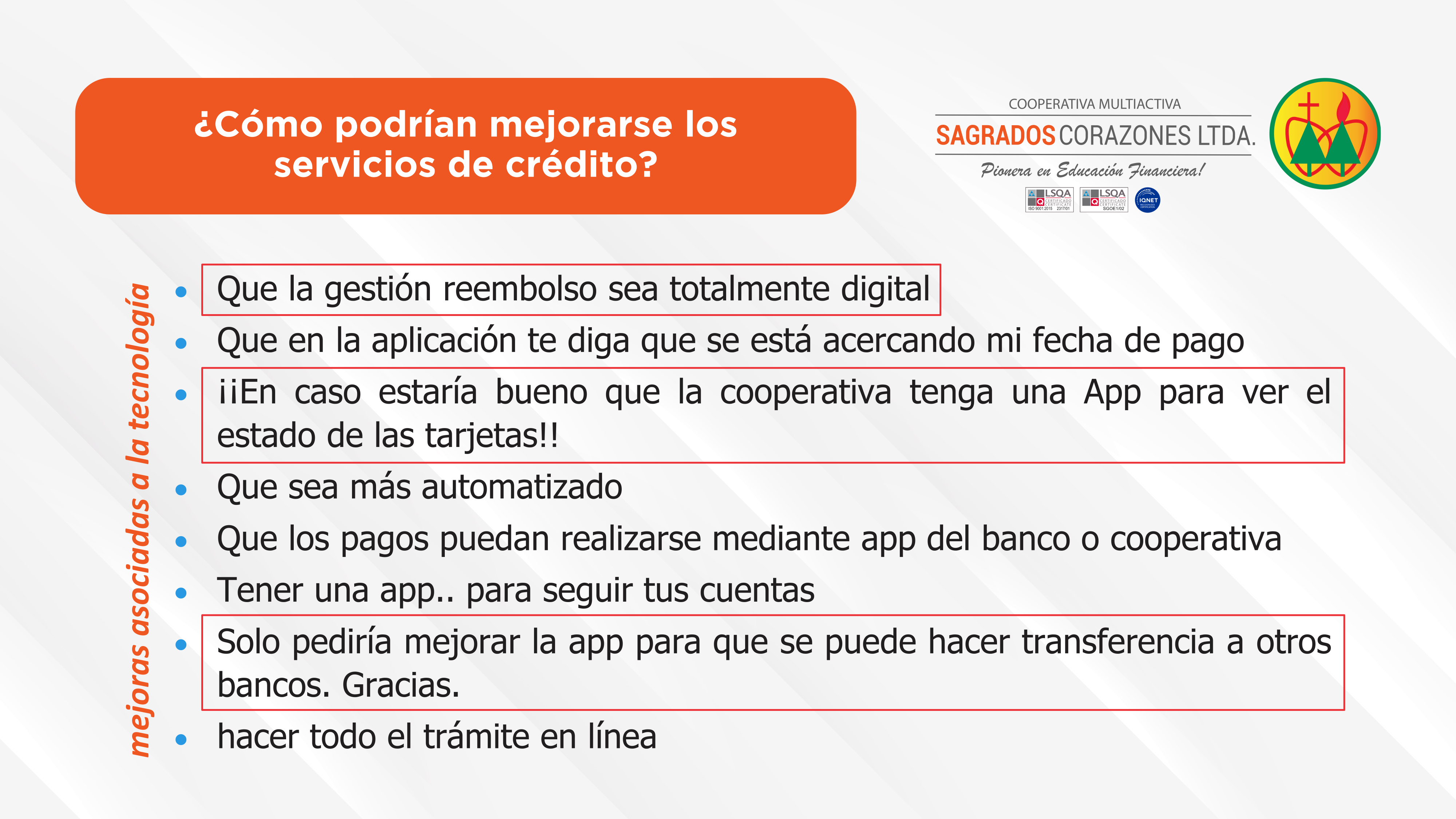 La realización de esta encuesta demuestra el compromiso por parte de la cooperativa al interesarse en la opinión de sus asociados y utilizar como herramienta fundamental para la mejora continua de sus servicios financieros y no financieros.