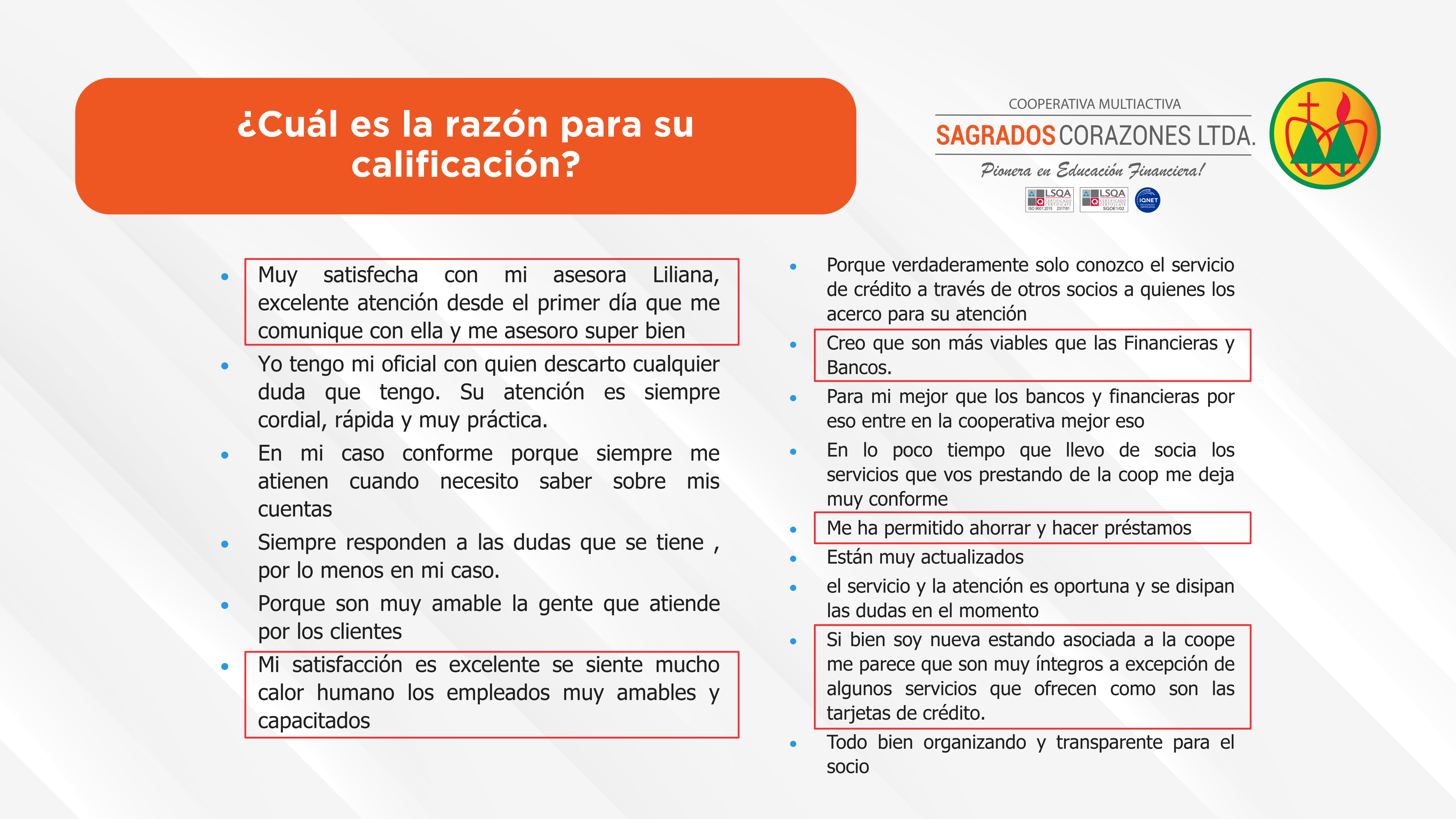 El 95% de los asociados se muestra conforme con los servicios brindados por la Cooperativa Sagrados Corazones Lda.